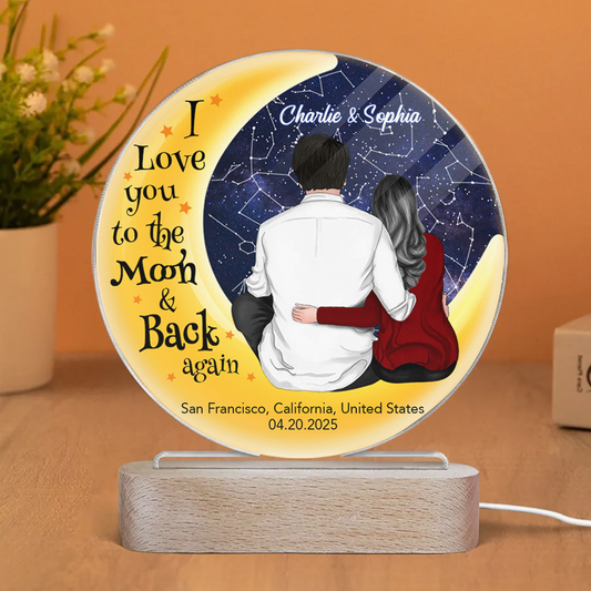 Love You To The Moon Couple Sitting On Moon Personalized Star Map Circle Acrylic Plaque With LED Night Light, Heartfelt Anniversary Gift For Her, For Him