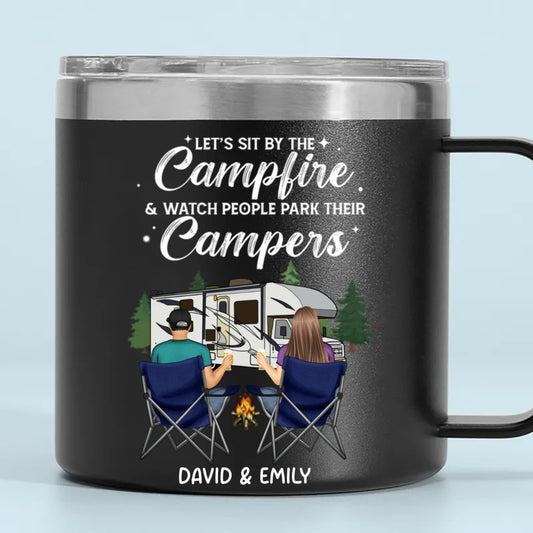 14oz Couple - Let's Sit By The Campfire - Personalized Stainless Steel Tumbler With Handle