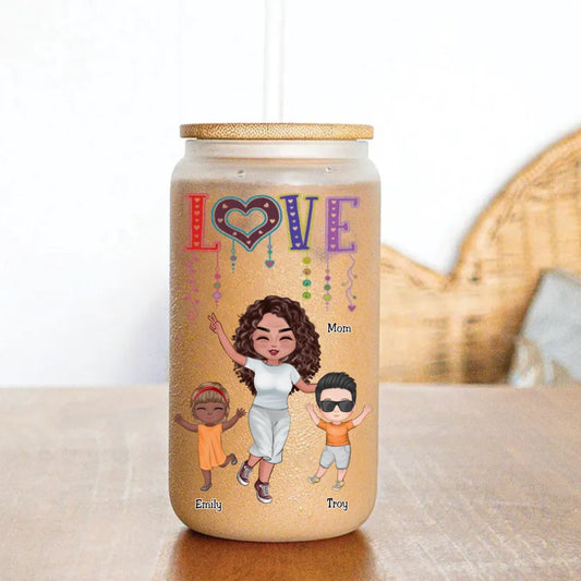 Family - Love Happy Doll Grandma Mom With Kids - Personalized Glass Can