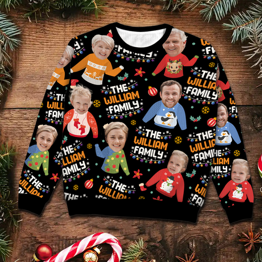Family Photo Upload Funny Christmas Personalized Faux Knit Ugly Sweater