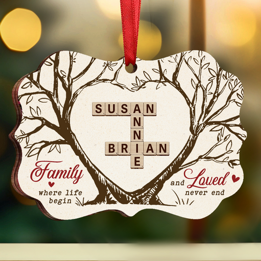 Family Where Life Begins And Love Never Ends Crossword Scrabble - Personalized Medallion Wooden Ornament