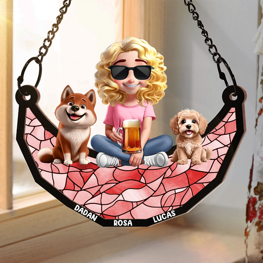 3D Cartoon Dog And Women Sit On The Moon - Personalized Window Hanging Suncatcher Ornament