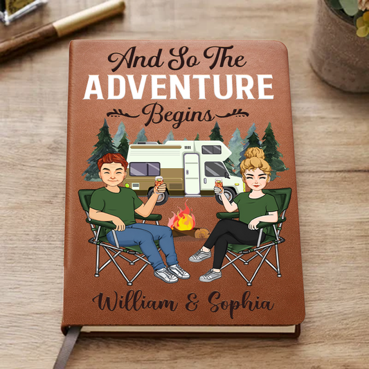 The Adventure Book Cartoon Couple Camping - Personalized Leather Journal