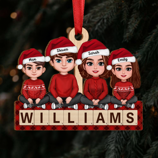 Whole Family Sitting On Word Personalized Wooden Ornament