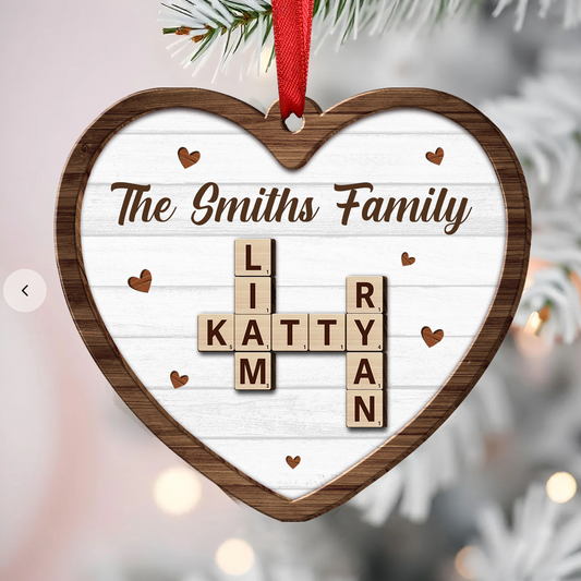 Custom Family Name Heart Crossword Scrabble - Personalized Wooden Ornament