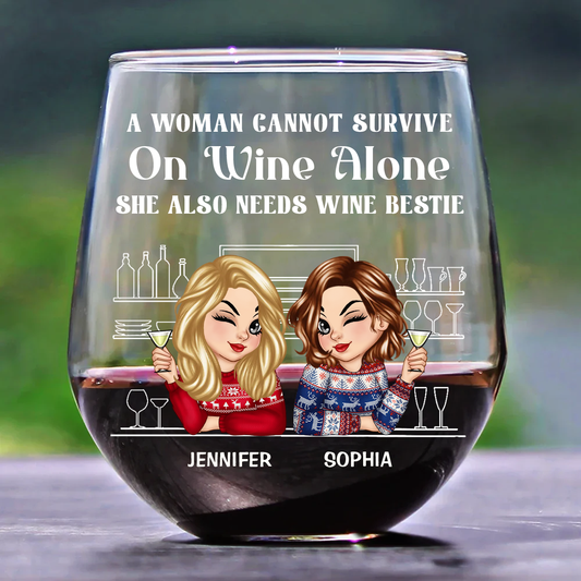A Woman Cannot Survive On Wine Alone Besties - Personalized Stemless Wine Glass