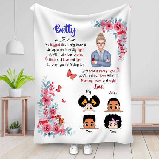 Grandma and Grandkids - We Hugged This Lovely Blanket We Squeezed It Really Tight We Fill It With Our Wishes. Hope And Love And Light So When You're Feeling Low... - Personalized Blanket