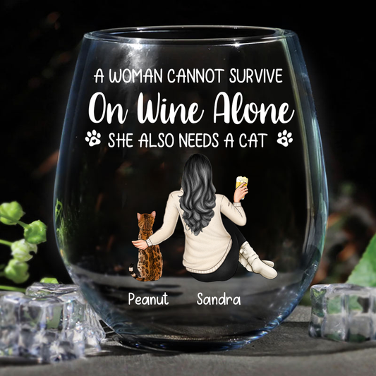 A Woman Cannot Survive On Wine Alone Cat Mom - Personalized Stemless Wine Glass