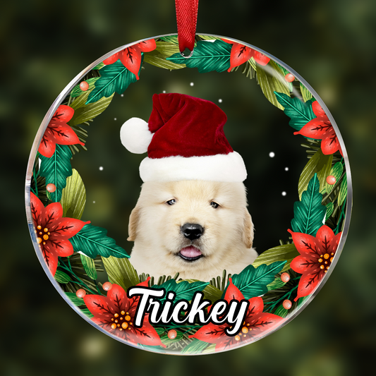 Custom Photo Pet Face Christmas Wreath Dog Cat Pet Memorial - Personalized Circle Glass Ornament