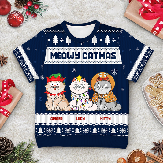 Meowy Catmas Funny Cartoon Cat Pet Lover Christmas Gift - Personalized Short Sleeve Sweater