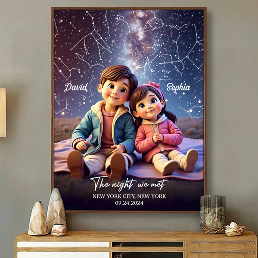 Cartoon Couple Sitting Under the Starry Night Personalized Poster, Custom Star Map by Date & Location, Anniversary, Birthday Gift for him, Gift for her