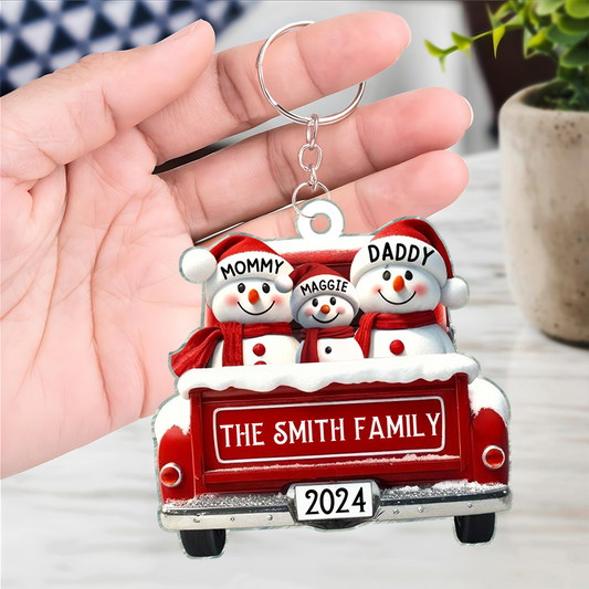Personalized Snowman Family Acrylic Christmas Ornament, Red Truck Custom Name 3D Effect Ornament
