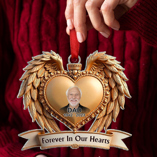 Forever In Our Hearts Angel Wings Photo Upload Memorial 3D Effect Personalized Acrylic Flat Ornament