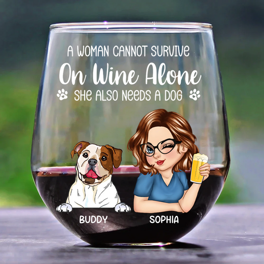 A Woman Cannot Survive On Wine Alone Dog Moms - Personalized Stemless Wine Glass