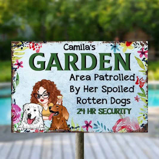 Gardening Lovers - Garden Area Patrolled By Her Spoiled Rotten Dogs - Personalized Metal Signs