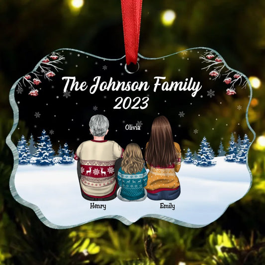 Family - Dad Mom Kids Dogs Cats Snow Background - Personalized Acrylic Ornament