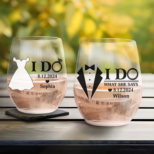 Couple I Do & I Do What She Says Married - Personalized Stemless Wine Glass