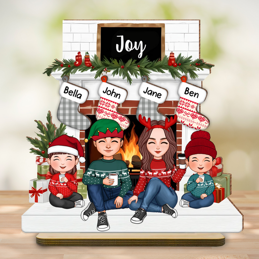 Cute Family Dad Mom Kids Sitting At Christmas Fireplace Personalized 2-Layer Standing Wooden Plaque