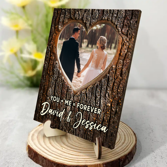 Custom Photo Pencil Drawing Carved In Love Couple You + Me = Forever - Personalized 2-Layered Wooden Plaque With Stand