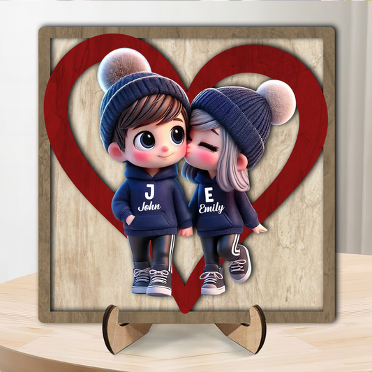 Personalized Initials Heart Sign Personalized 2-Layered Wooden Plaque, Cute Cartoon Couple Walking, Tiered Tray Valentines Signs or Shelf Signs