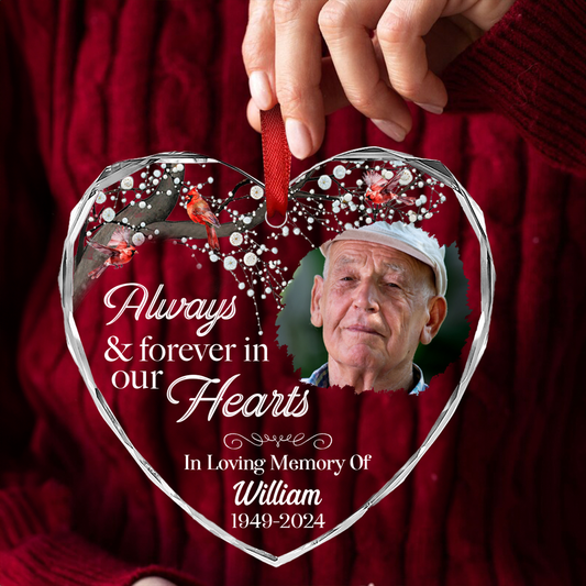 Custom Photo Always And Forever In Our Hearts Memorial - Personalized Heart Shaped Acrylic Ornament