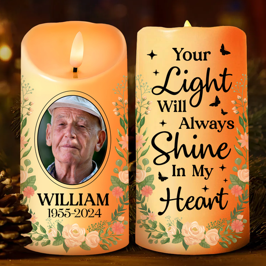 Custom Photo Your Light Will Always Shine In Our Hearts Memorial - Personalized Flameless LED Candle