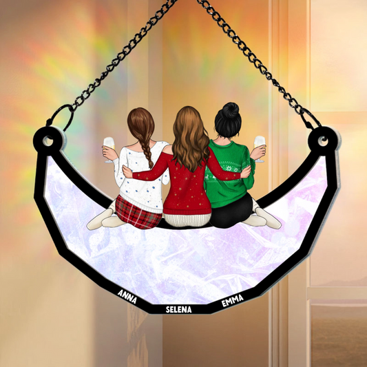 Besties Friends Sitting On The Moon - Personalized Window Hanging Rainbow Suncatcher