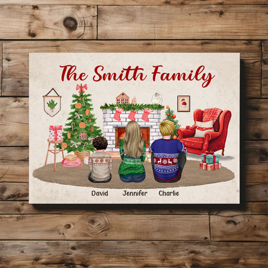 Christmas Family Back View Sitting Together At Fireplace Personalized Poster