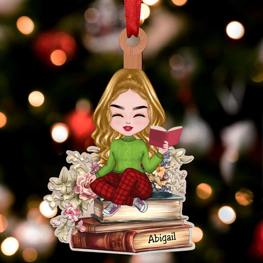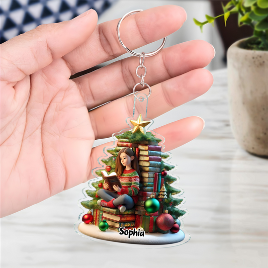 Book Christmas Tree Girl Sitting Acrylic Keychain, Personalized Book Christmas Tree Ornament, Christmas Gift For Book Lovers