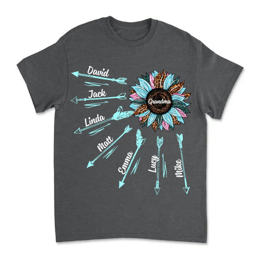 Grandkids - Grandma & Kid's Name Arrow Sunflower - Personalized T-shirt