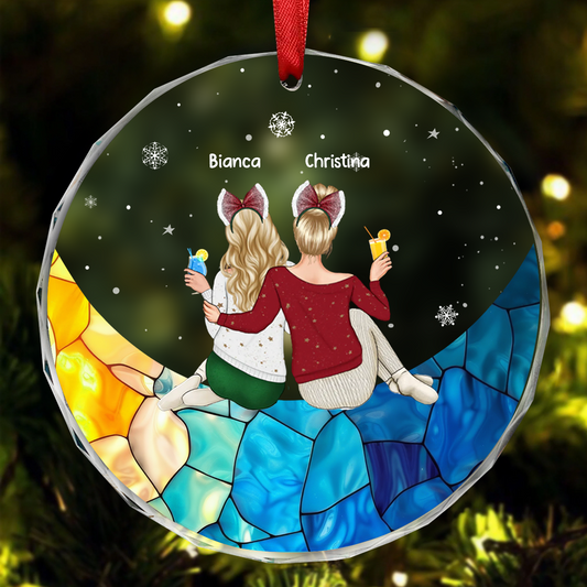 Christmas Besties Sister Sitting On The Moon - Personalized Circle Ornament