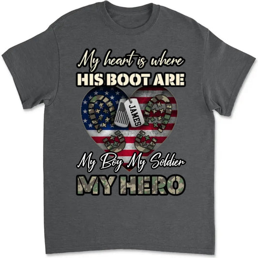 Family - My Heart Is Where His Boots Are, My Son My Soldier My Hero - Personalized T-Shirt