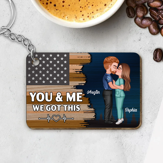 Hero Couple Kissing Half Flag Gift by Occupation Firefighter, Nurse, Police Officer Personalized Wooden Keychain