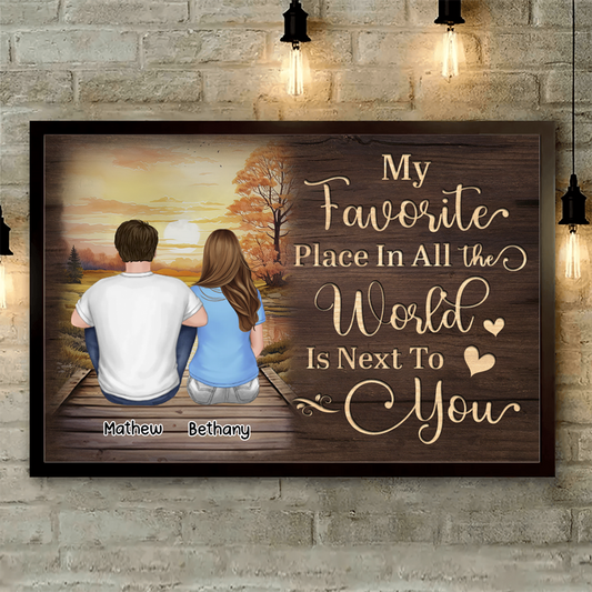 Couple Sitting Back View Wooden Sunset Lake Personalized Horizontal Poster
