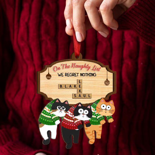 On The Naughty List We Regret Nothing Crossword Puzzle Art Personalized Wooden Ornament, Unique Christmas Gift For Cat Owners
