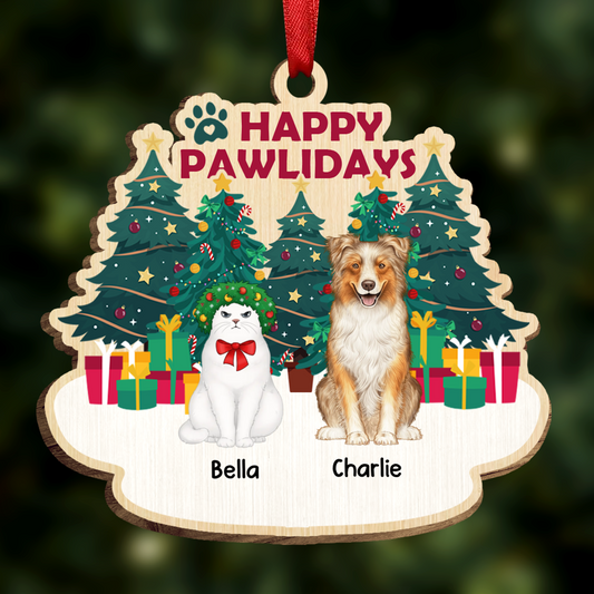Happy Pawlidays Christmas Dogs Cats Sitting - Personalized Custom Shaped Wooden Ornament