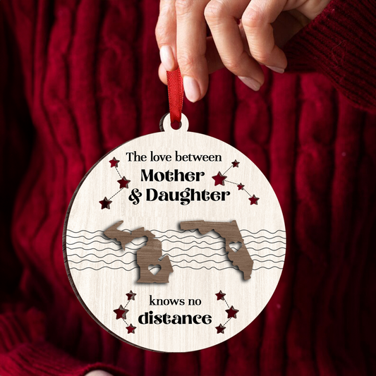 The Love Between Mother Daughter Knows No Distance, Long Distance State Personalized 2-Layer Wooden Ornament, Togetherness Chritmas Gift
