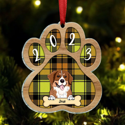 Personalized Custom Paw Shaped Wood Christmas Ornament - Dog, Cat And Snow - Plaid Buffalo Pattern - Customized Decoration Upload Image, Gift For Pet Lovers