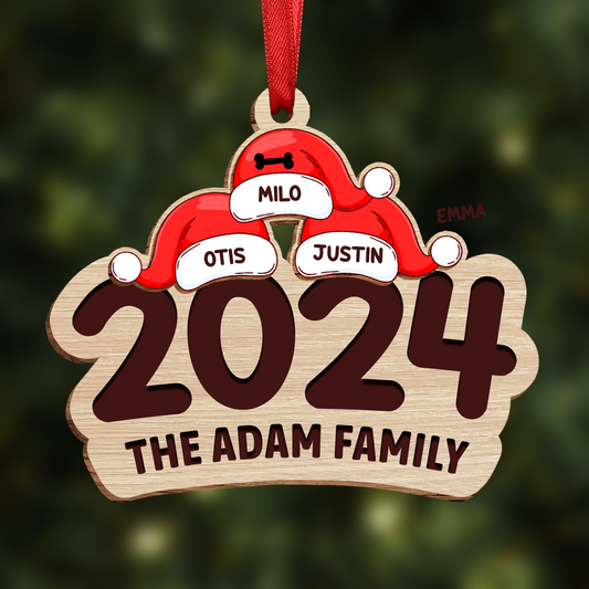Christmas Family Name Santa Hat 2024 - Personalized 2-Layered Wooden Ornament