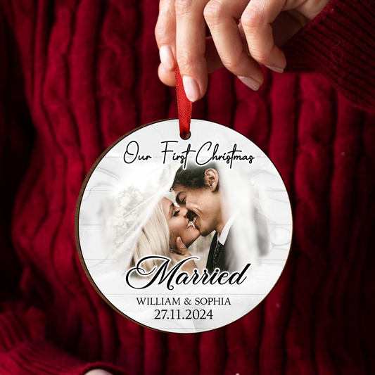 Custom Photo First Christmas As Mr & Mrs Couples - Personalized Custom Shaped Wooden Ornament
