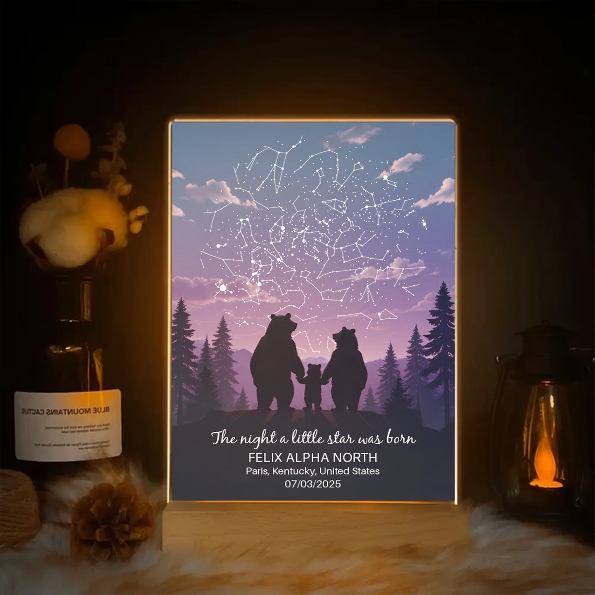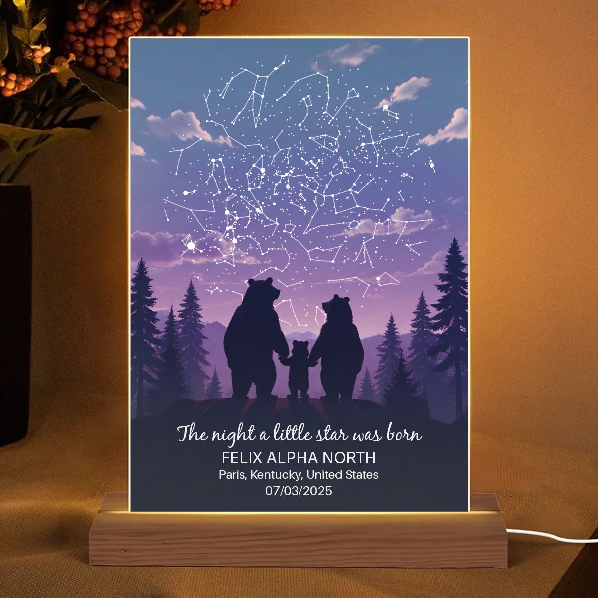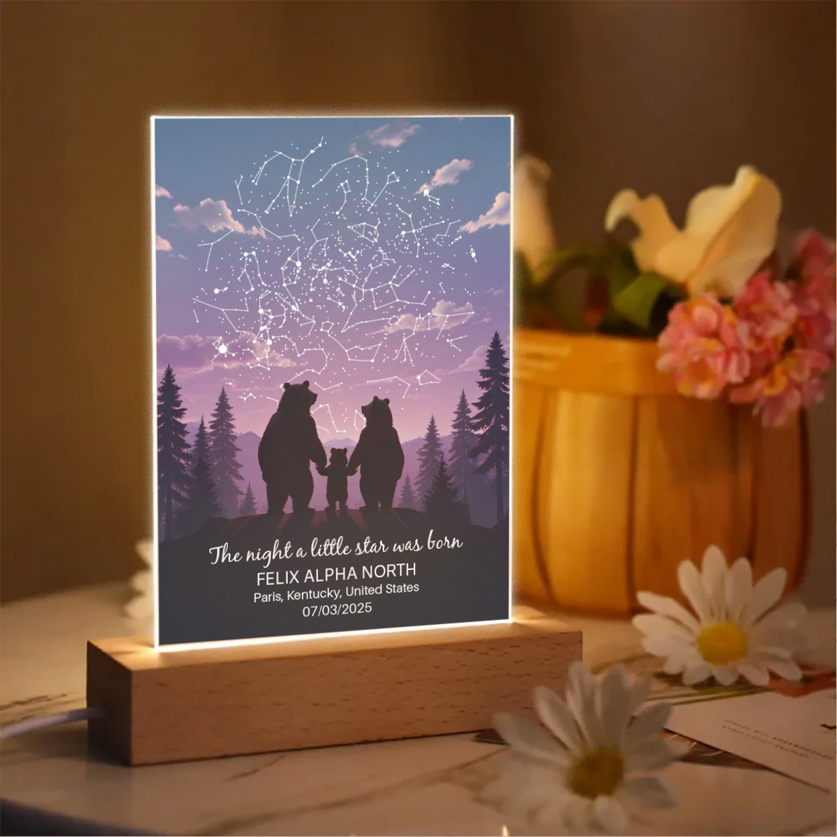 Bear Family Night Sky Constellation Print Personalized Acrylic Plaque With LED, Perfect Home Decor Newborn First Birthday Gift For Newborn, Gift For New Parents