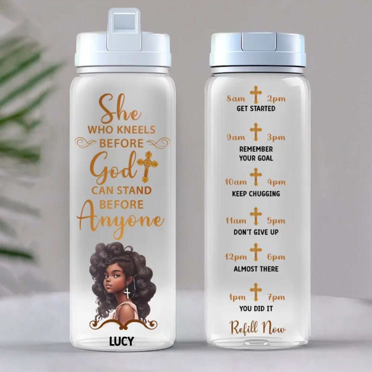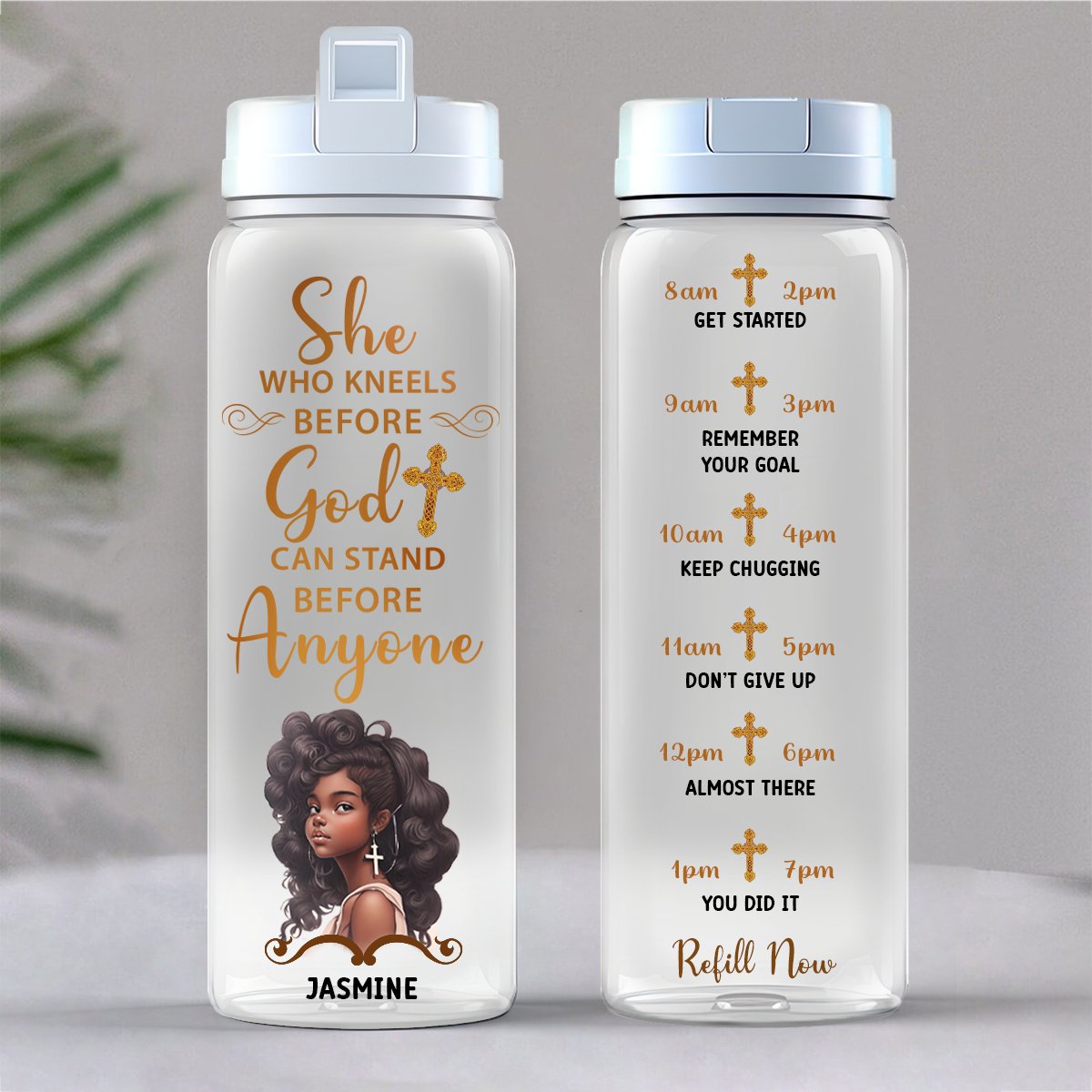 Christian - She Who Kneels Before God Can Stand Before Anyone - Personalized Water Tracker Bottle
