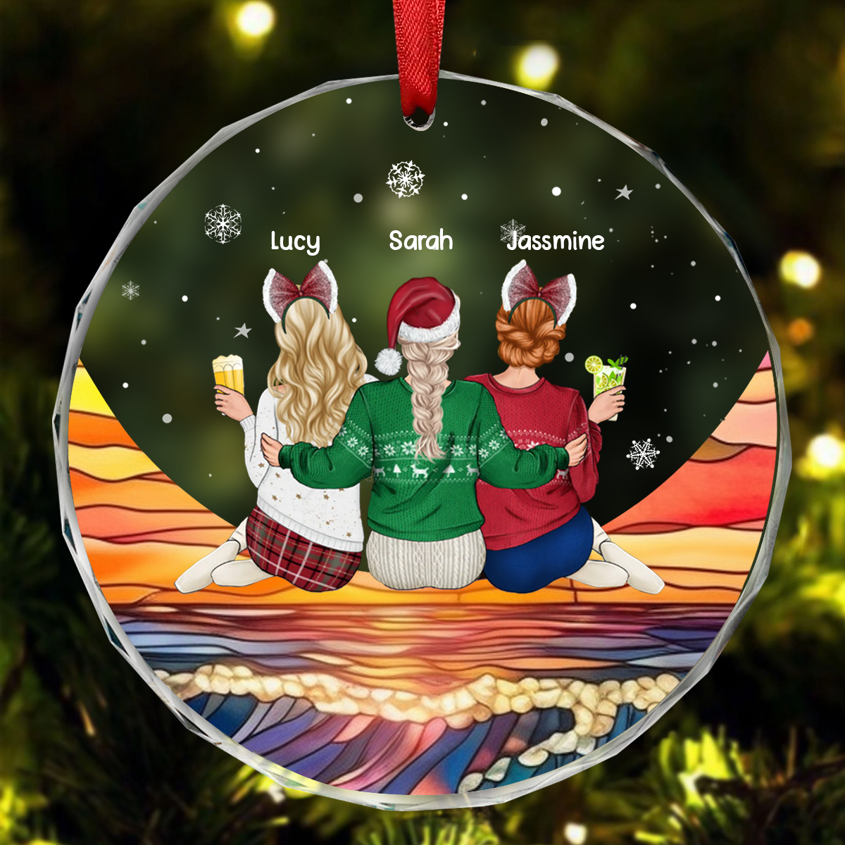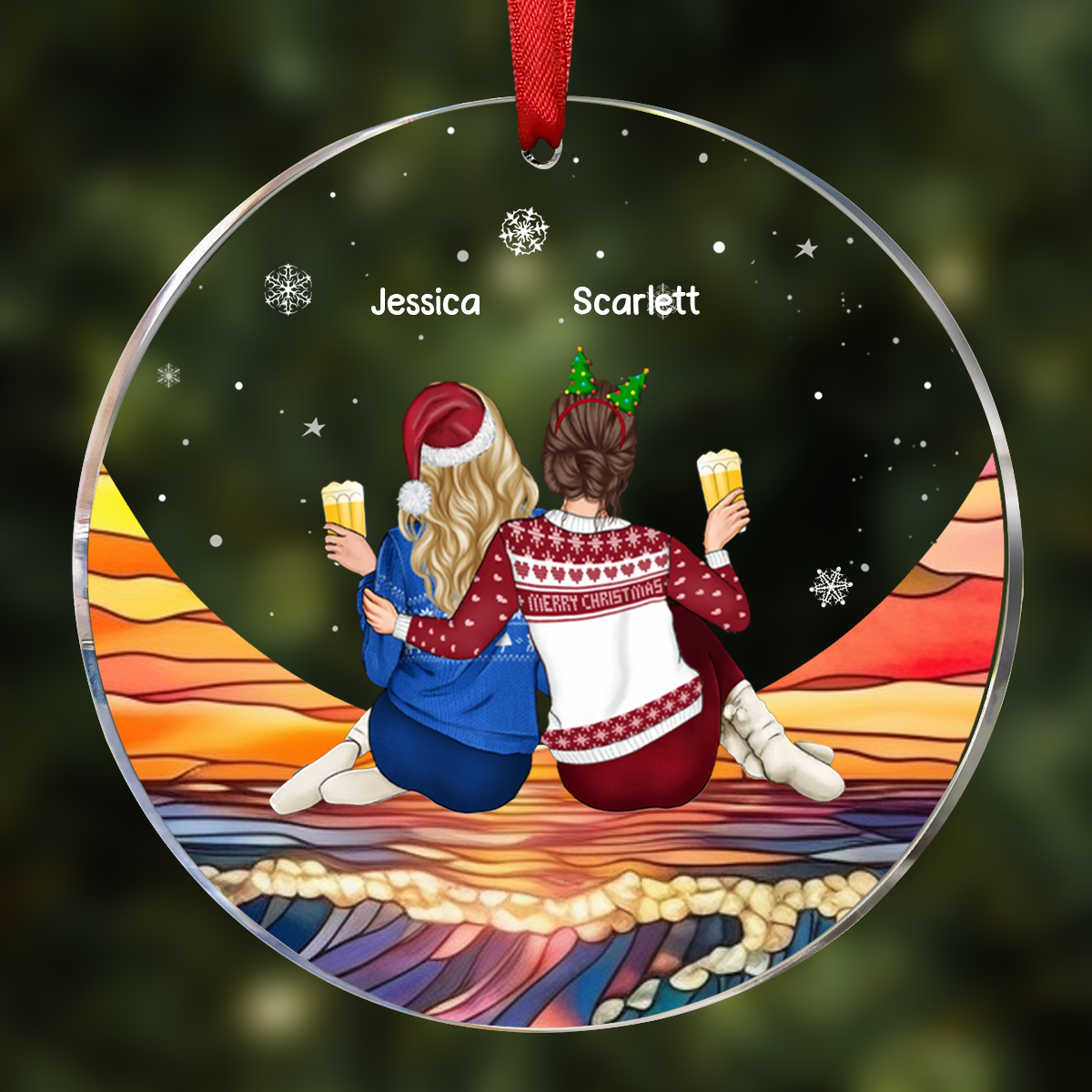Christmas Besties Sister Sitting On The Moon - Personalized Circle Ornament