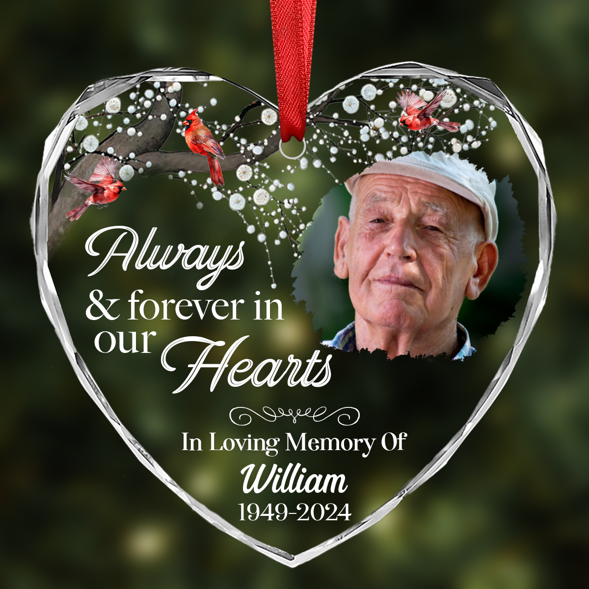 Custom Photo Always And Forever In Our Hearts Memorial - Personalized Heart Shaped Acrylic Ornament