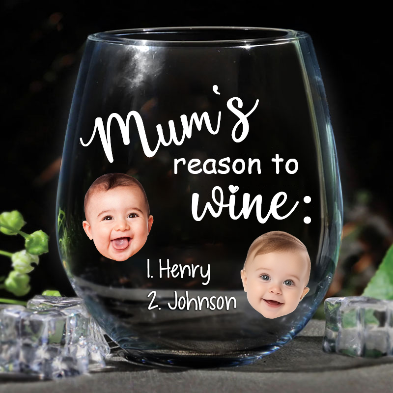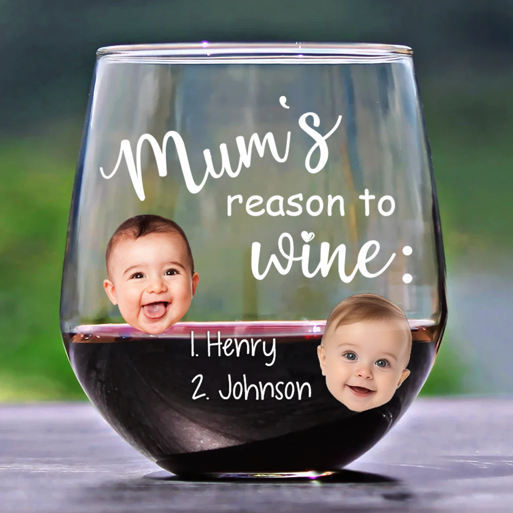 Custom Photo Mom's Reasons To Drink Custom Kid Names - Personalized Stemless Wine Glass