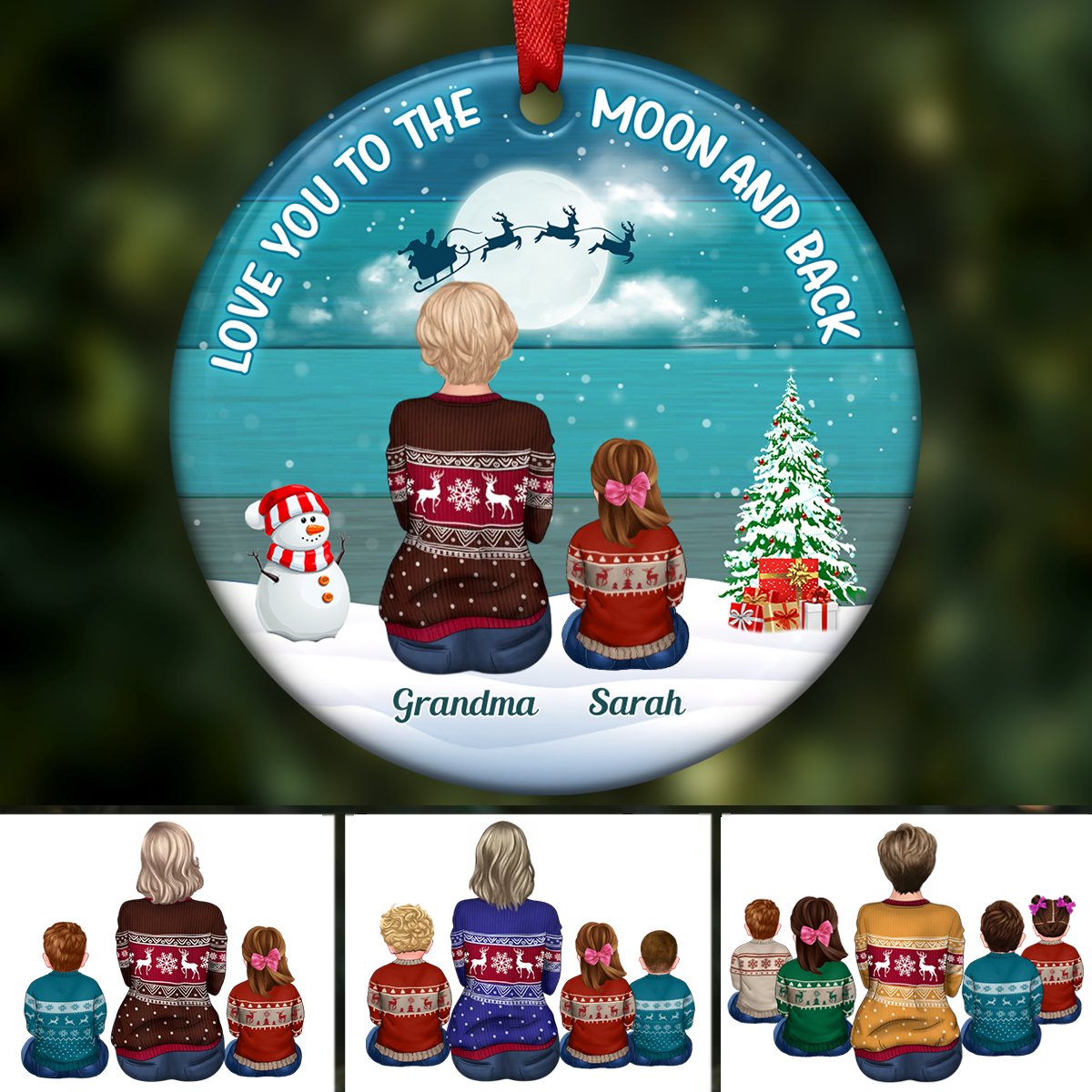 Family - Blue Palette Moon Grandma & Grandkids Back View - Personalized Circle Ornament