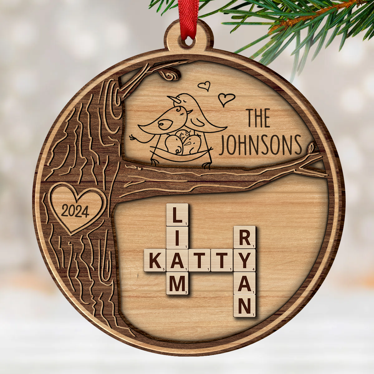 Family Tree Crossword Puzzle Art, Personalized 2-Layered Wooden Ornament