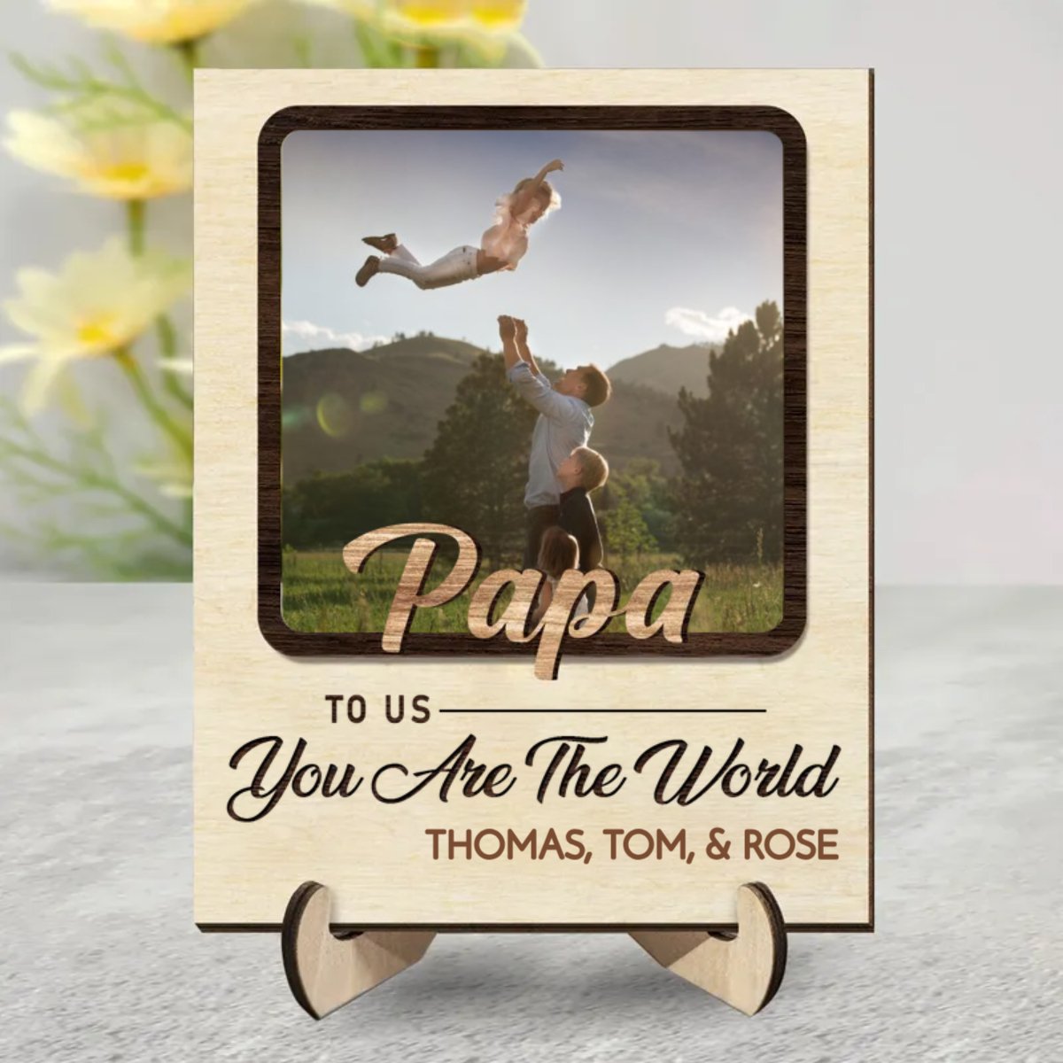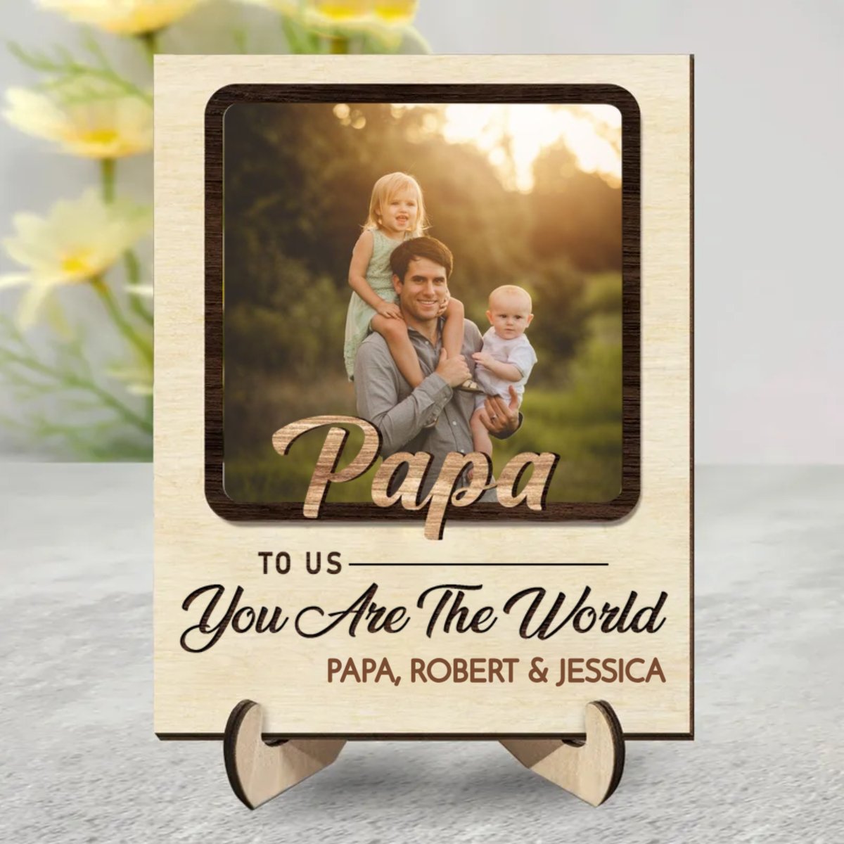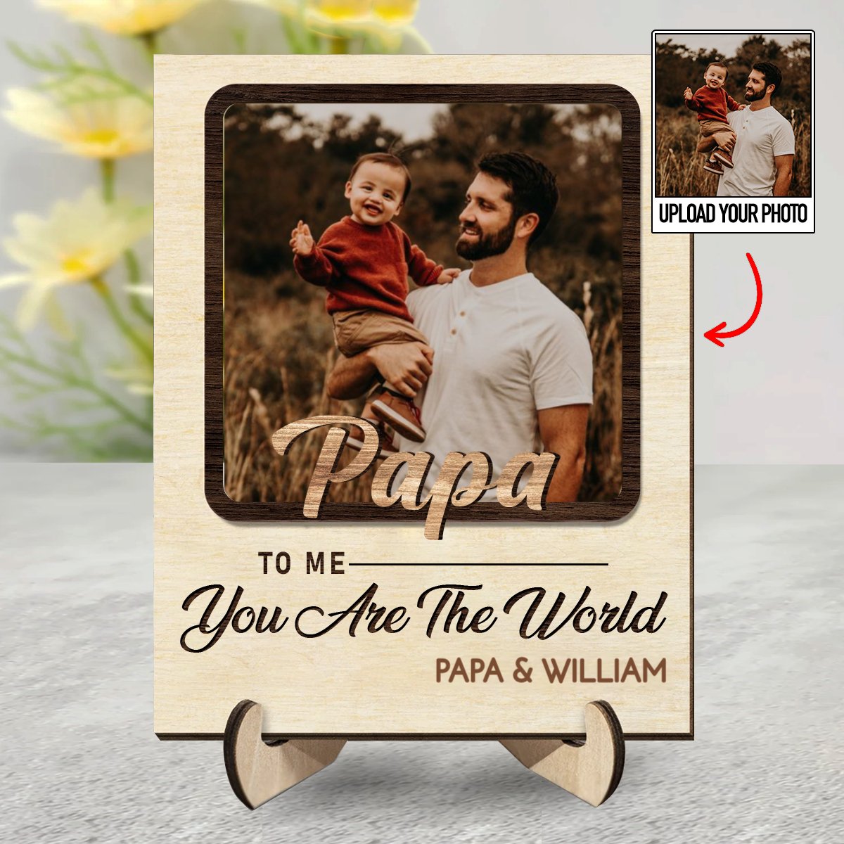 Father - Custom Photo Papa To Us You Are The World - Personalized 2-Layered Wooden Plaque With Stand