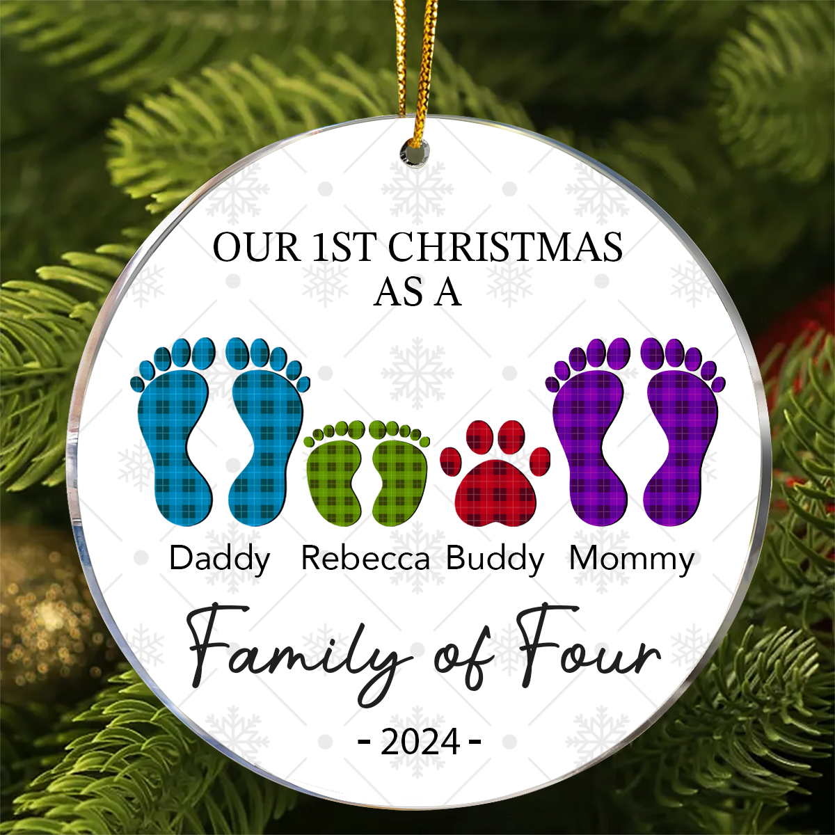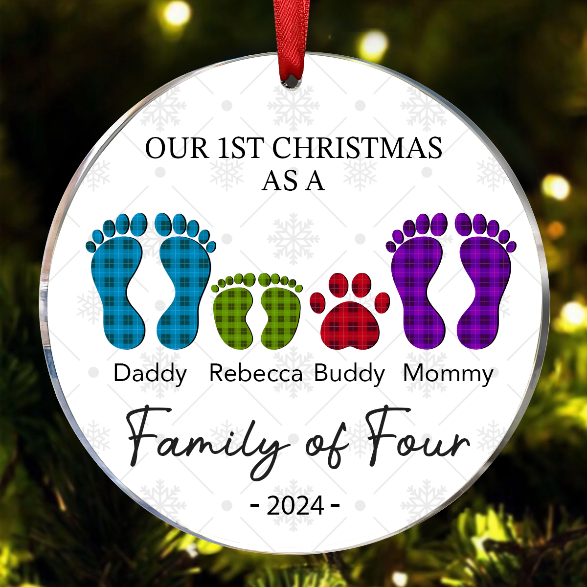 First Christmas As A Family Of Four Flannel Footprints - Personalized Circle Acrylic Ornament