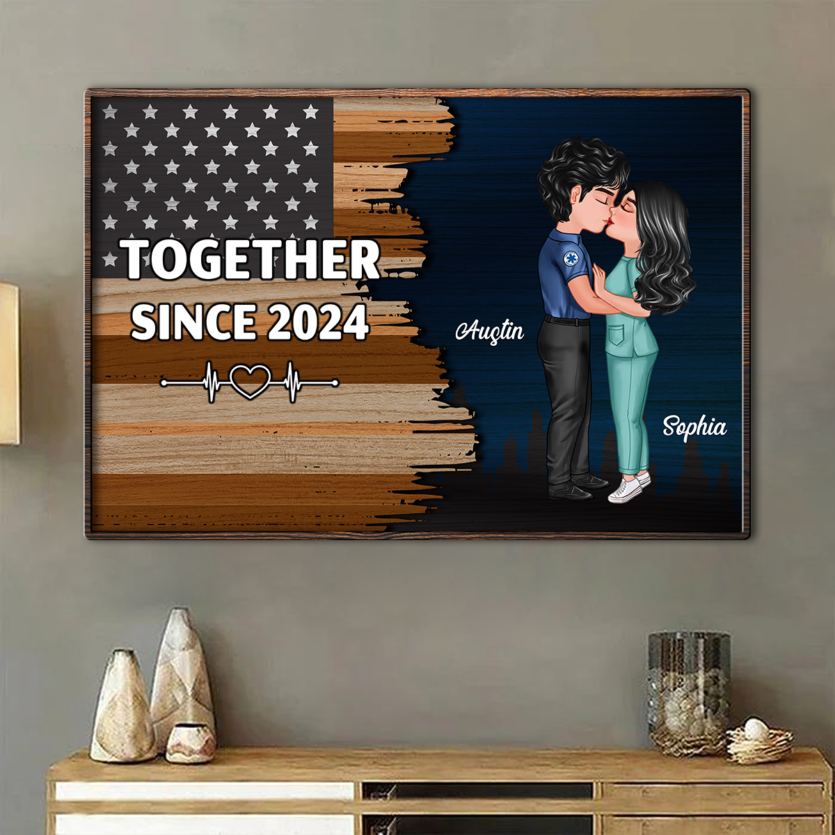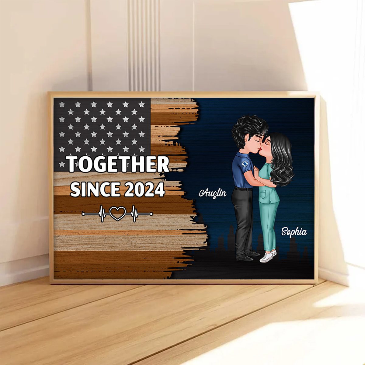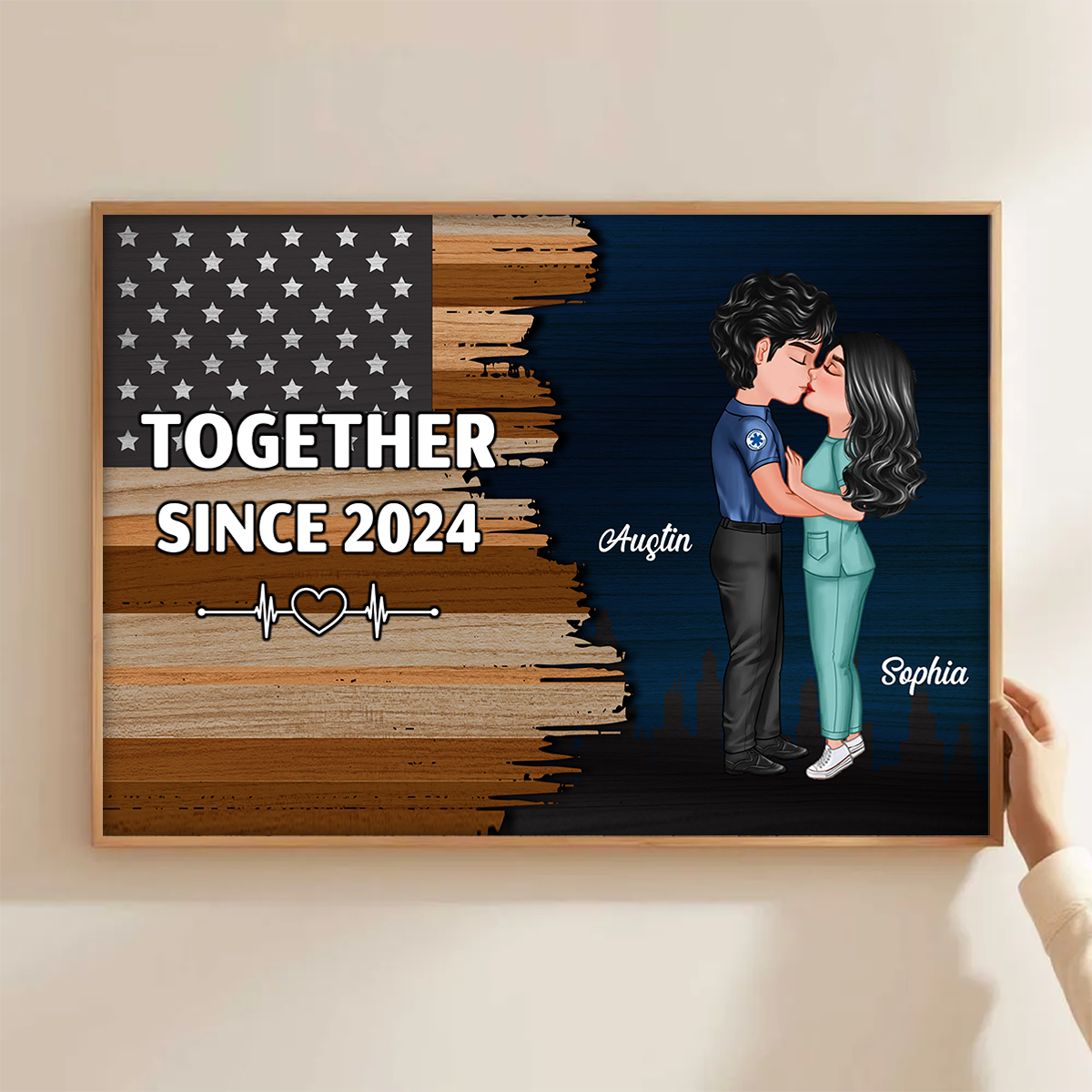 Hero Couple Kissing Half Flag Gifts by Occupation Firefighter, Nurse, Police Officer Personalized Horizontal Poster